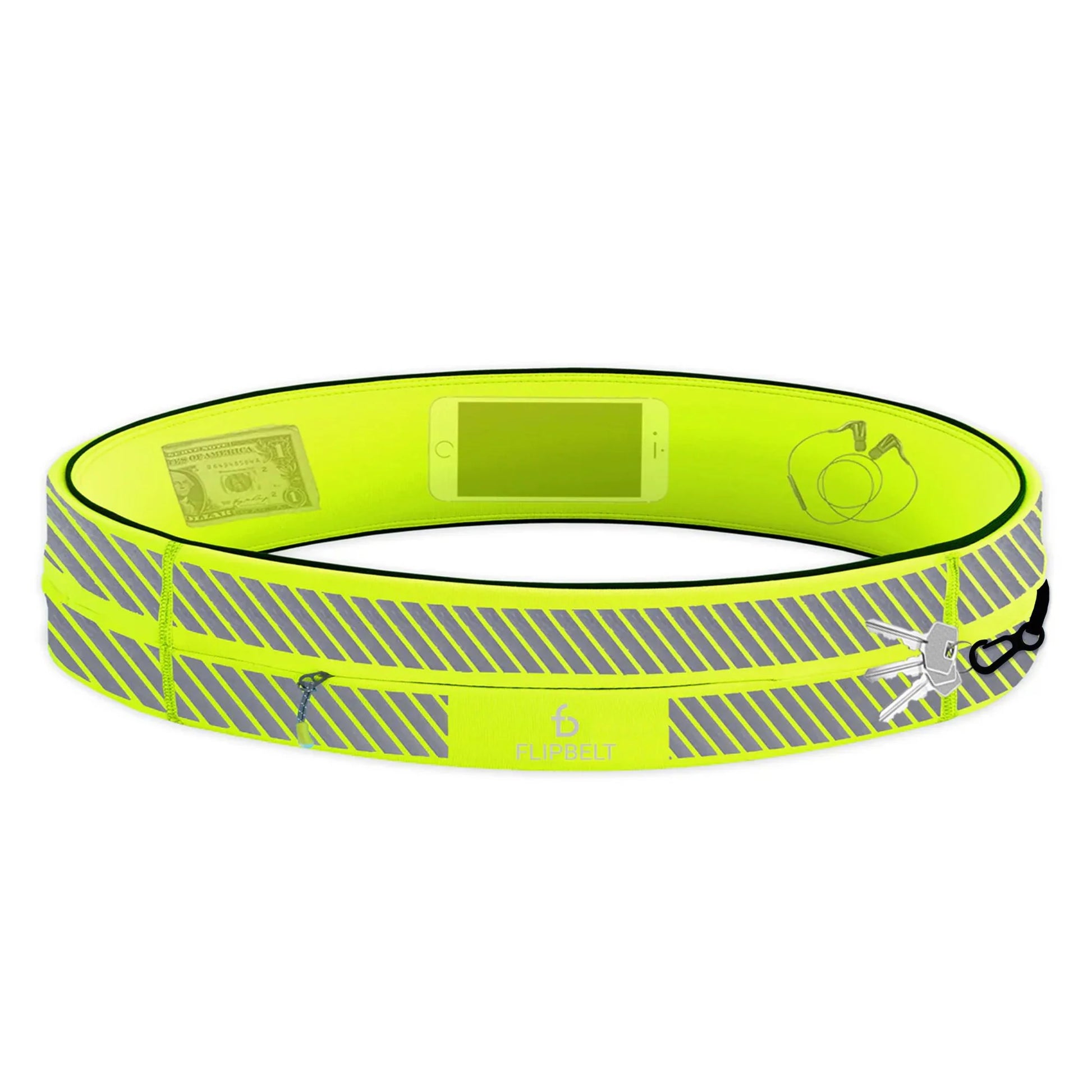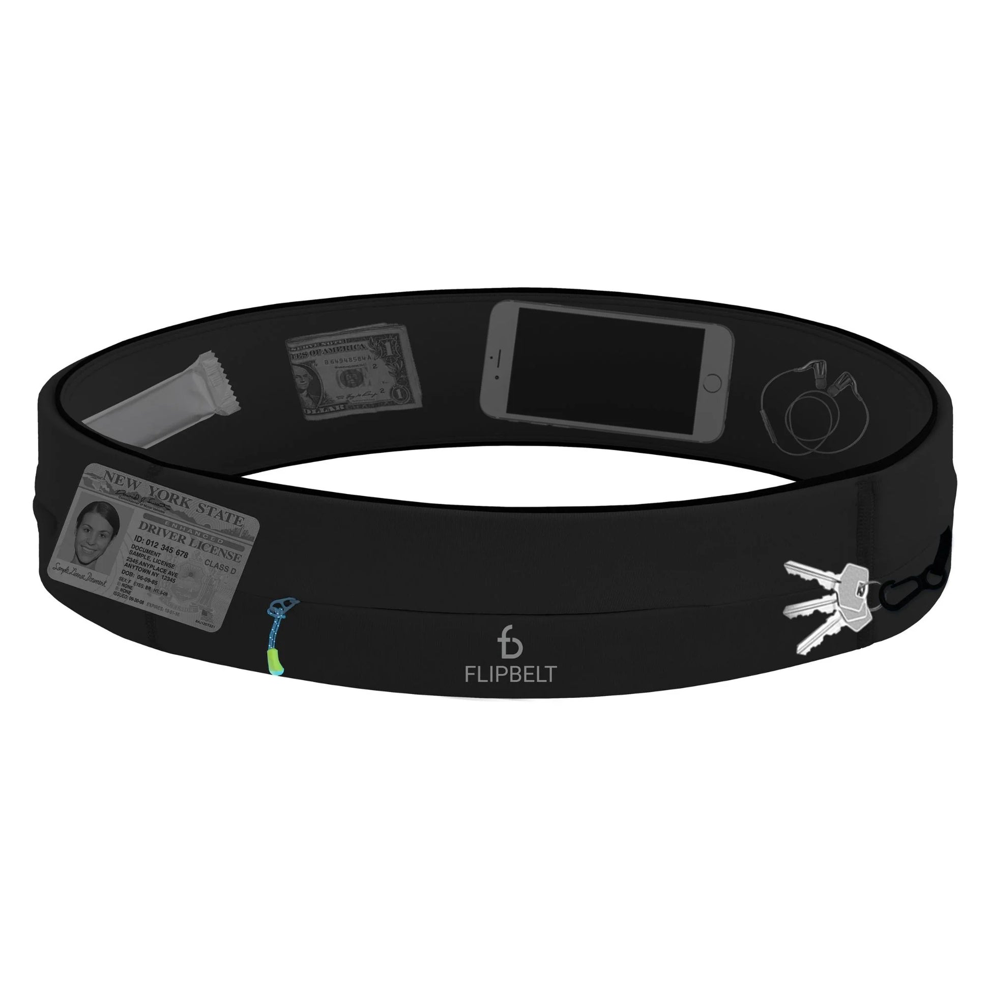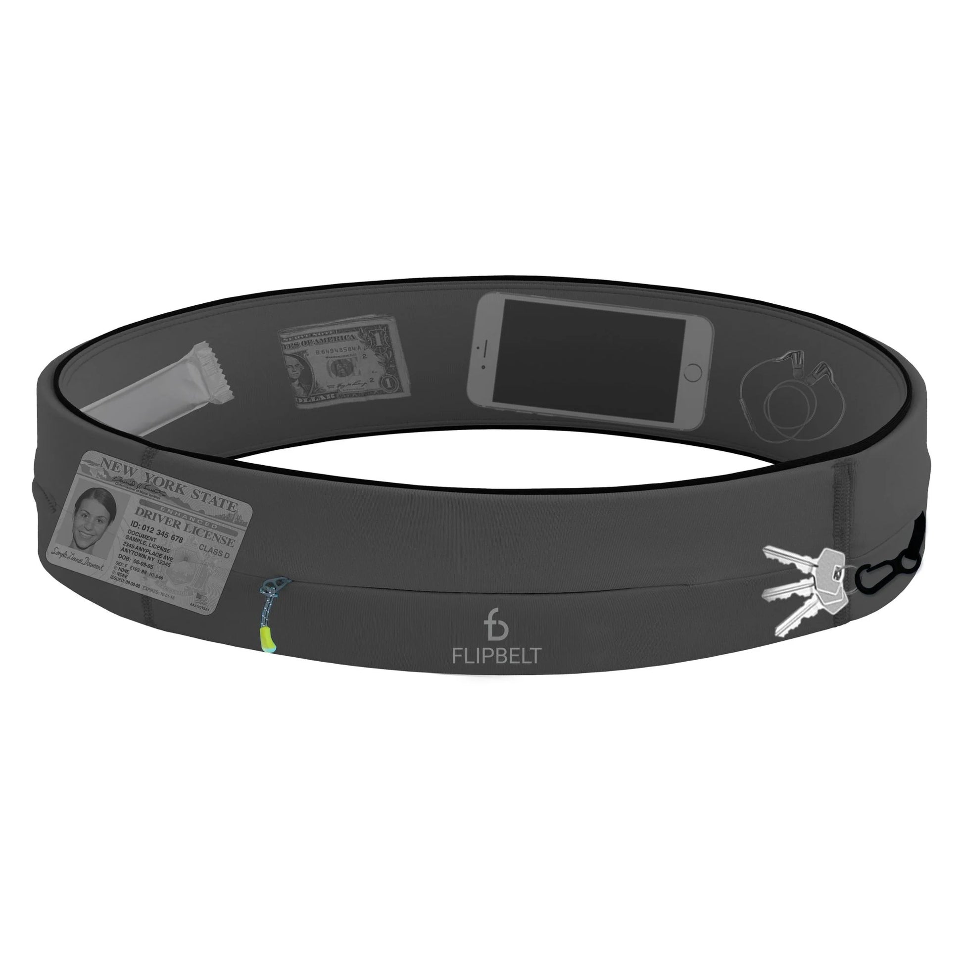The GoBelt Zipper running belt with pockets is easy to use, comfortable and carries everything you might need while traveling or exercising – including your phone, keys, ID, cards, cash, medical devices and more. Simply step into the GoBelt Zipper like a pair of pants, place it in a comfort position on your hips, and forget that you're wearing it. Easily slide in your essentials through any of the three access points, secure your keys on the sewn-in clip and place valuables inside the zipper pocket. Once on, the GoBelt Zipper stays securely in place without bouncing or shifting. See also our adjustable zipper belt.